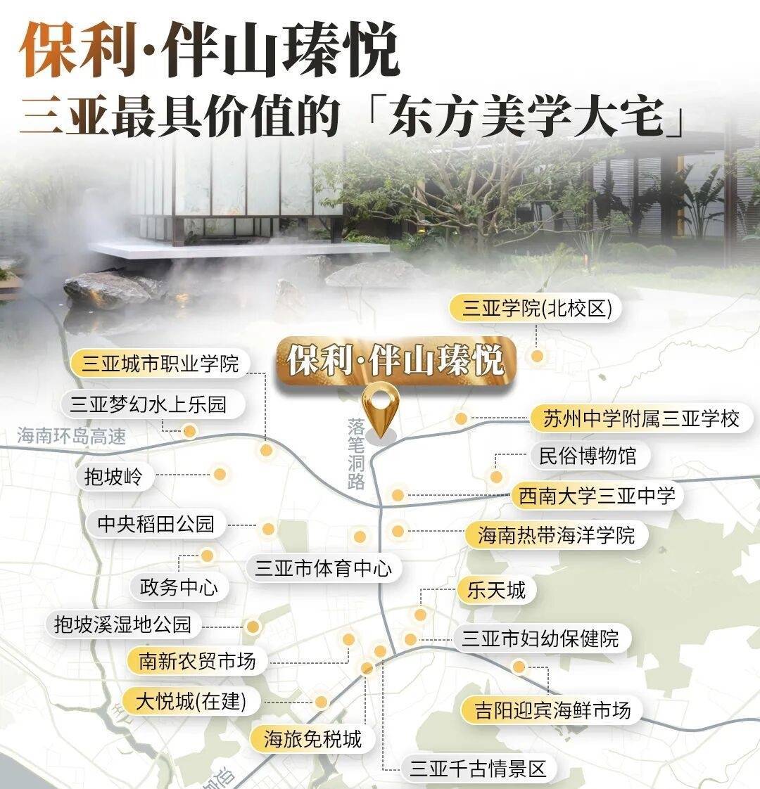 保利·伴山瑧悦项目紧邻承载自贸创新、城市服务、政务服务和生态宜居为一体的抱坡新城三亚新中心,住在这儿,无论是休闲娱乐、教育资源、生活的烟火气还是医疗资源,都是举步即达的便利。