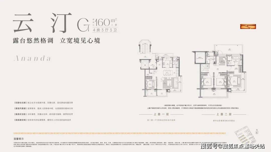 最大约5.9m双阳台阔厅;首层拥有约3.3米层高,南北双露台、南北通透主卧套房。顶楼半坡空间,最高层高约2.2m。拥有独立玄关和观景外廊双重归家礼序。