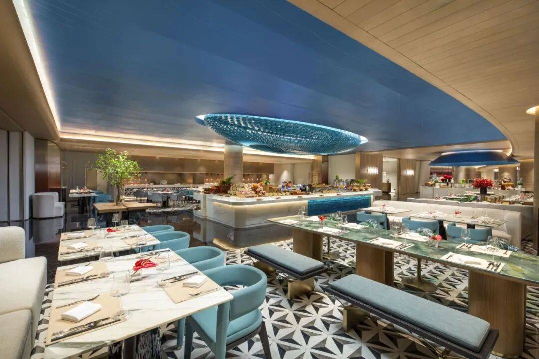 璇宫西餐厅,以地中海蓝与中东琥珀棕为基调,利用简约主义的线条延伸,让室内充满轻奢与现代感十足的格调氛围,惬意且舒适。餐厅提供特色自助早餐及丰盛海鲜自助午餐及晚餐等多样化美食体验,严格甄选各类食材,鲜活海鲜池及中西风味任选任食,琳琅满目让宾客畅享自助美好“食”光。