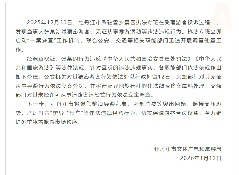 开元棋牌,开元棋牌APP下载,开元棋牌官方网站/开元棋牌[永久网址:363050.com]专注于线上棋牌游戏开发与运营。开元棋牌提供多种经典和创新的棋牌游戏,包括电子游戏、捕鱼、欧洲杯投注、斗地主、麻将、德州扑克等。开元,开元棋牌,开元体育,开元棋牌入口,开元APP下载,开元棋牌官网入口,开元棋牌官方网站,开元官方网站,开元棋牌APP下载开元棋牌APP下载,以高质量的游戏画面和流畅的操作为用户带来优越的游戏感受。13日,黑龙江省牡丹江市文体广电和旅游局发布情况通报称,2025年12月30日,牡丹江市派驻雪乡景区执法专班在受理游客投诉过程中,发现当事人张某涉嫌猥亵游客、无证从事导游活动等违法违规行为。执法专班联合公安、交通等相关职能部门迅速开展调查处置工作。经调查取证,张某的行为违反《中华人民共和国治安管理处罚法》《中华人民共和国旅游法》等法律法规。针对查明的违法违规事实,公安机关对其猥亵游客行为依法处以行政拘留12日;文旅部门对其无证从事导为依法立案处罚,并将涉及异地旅行社的违法线索移交属地处理;交通部门对其未经许可从事道路客运经营行为依法立案调查。(工人日报)
