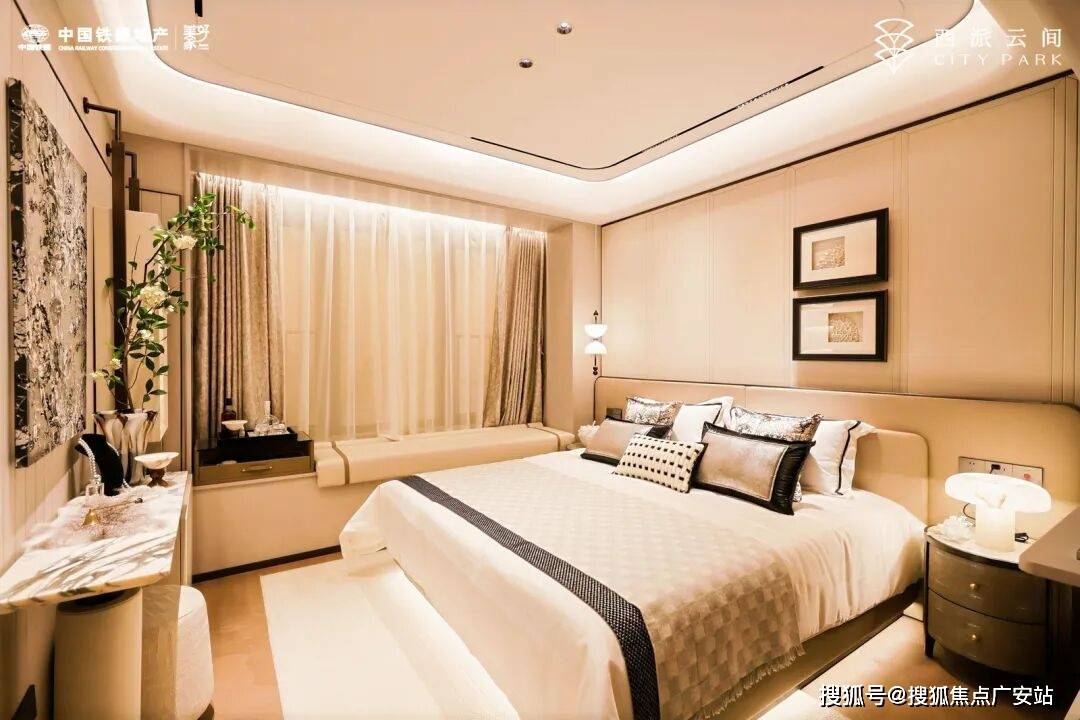 主卧套房设计同样让人惊喜:南向超大景观飘窗引景入室,放完标准双人床后,北侧还能打造整面衣柜;全明主卫功能分区清晰,定制淋浴房保障干湿分离,镜柜内置美妆冰箱,细节处尽显品质感。