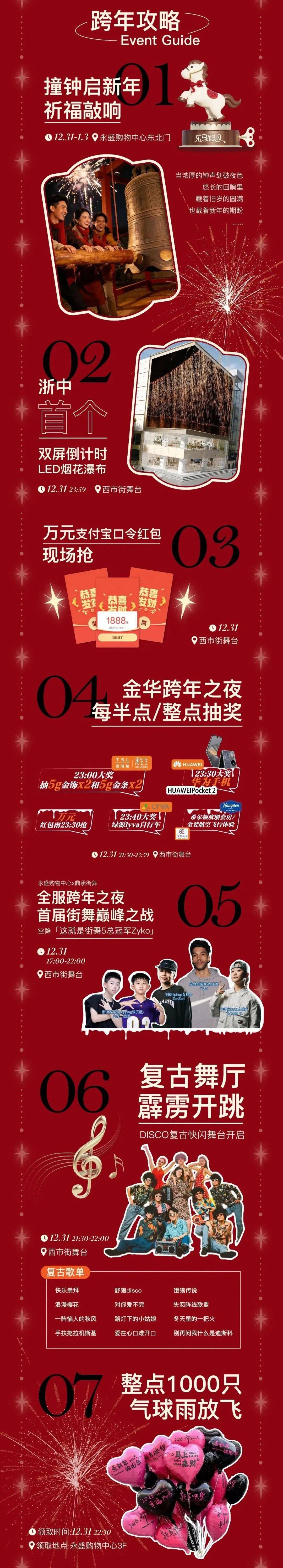 12月31日,永盛购物中心现场将举行撞钟仪式,共同迎接新年到来,并打造浙中首个双屏倒计时LED烟花瀑布盛景。整点时刻,漫天气球雨浪漫降落。