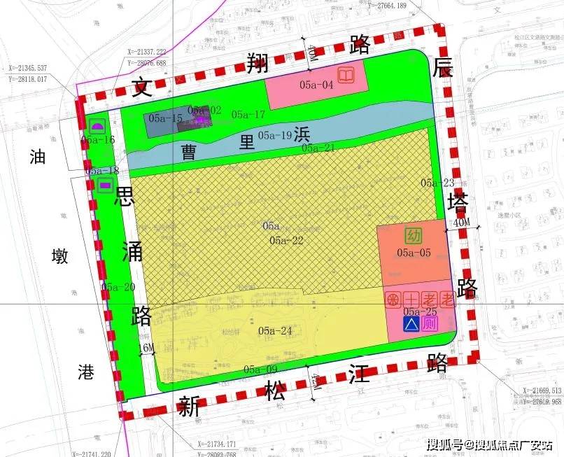 地块四至范围:东至05a-25号地块。南至新松江路、西至思涌路、北至05a-22地块,总用地面积约25913.27平方米,容积率1.2。