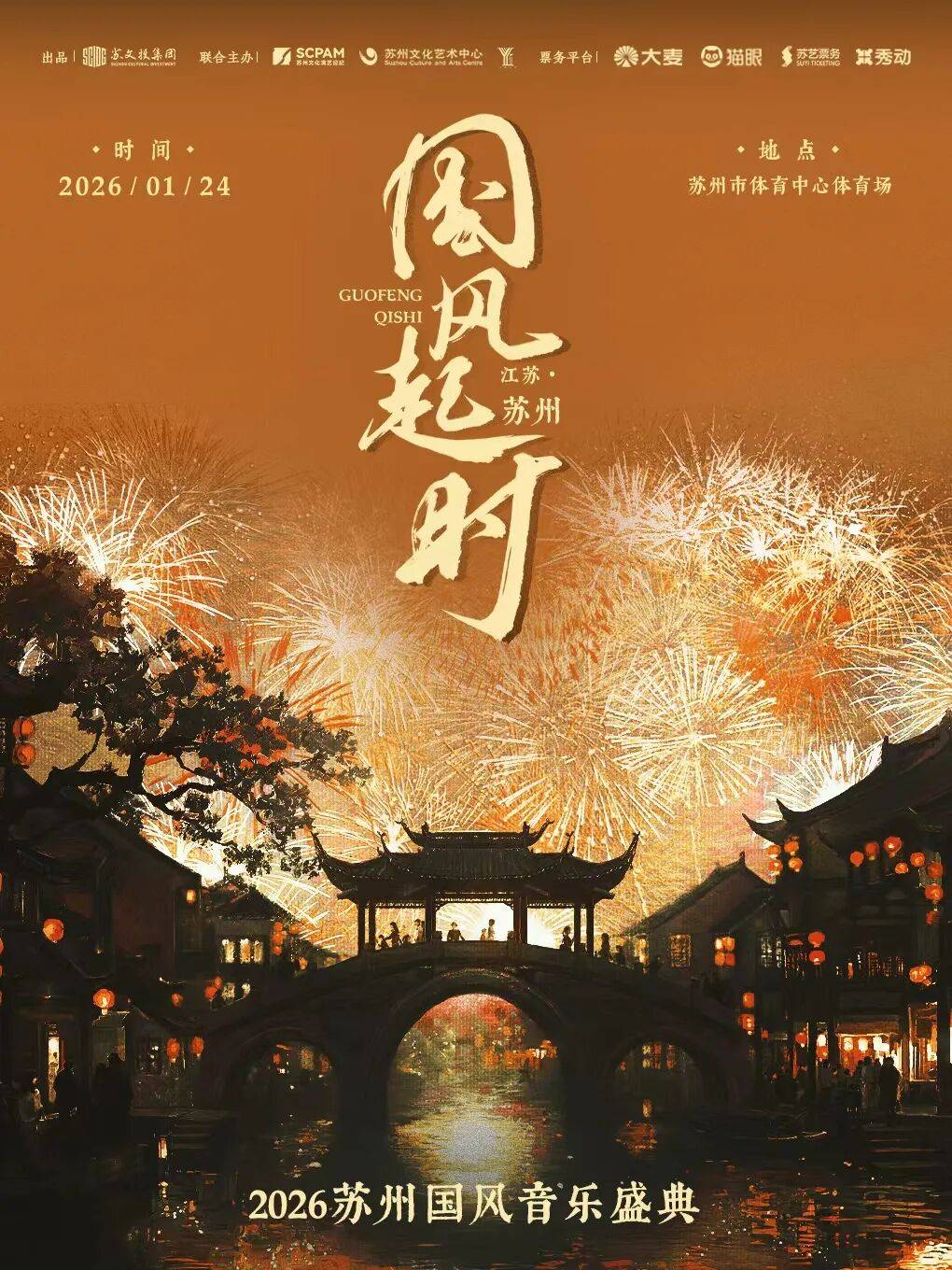 “国风起时” 2026苏州国风音乐盛典是由苏州文化投资发展集团出品,苏州文化演艺经纪公司、苏州文化艺术中心、厦门亦映文化联合主办的大型国风演唱会,将于2026年1月24日在苏州市三香路体育中心体育场举办。