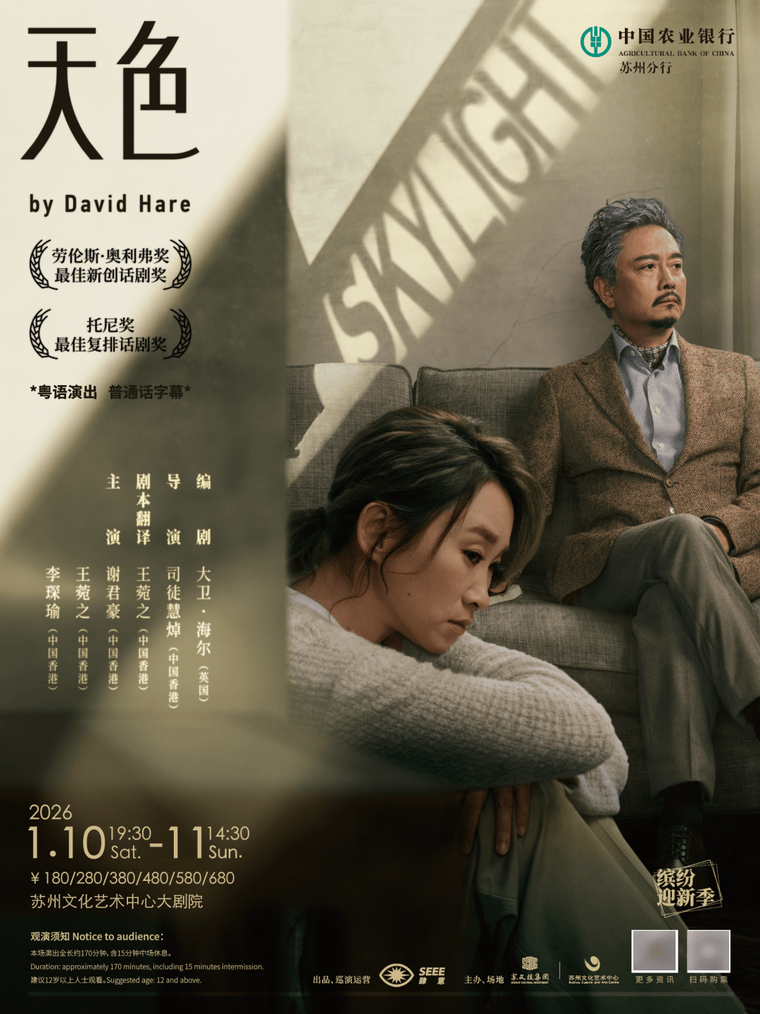由香港名导司徒慧焯担任导演,谢君豪、金像奖最佳女配王菀之、李琛瑜联合主演的话剧《Skylight天色》承载着剧迷的期待,即将在2026年1月10至11日来到苏州文化艺术中心。话剧《Skylight天色》改编自英国剧作大师大卫・海尔(David Hare)的经典剧作,奥斯卡提名导演斯蒂芬·戴德利(Stephen Daldry)执导,于1995年在英国国家剧院首演,引发热烈反响,一举摘得劳伦斯·奥利佛奖的最佳新创线 Olivier Award for Play of the Year)。