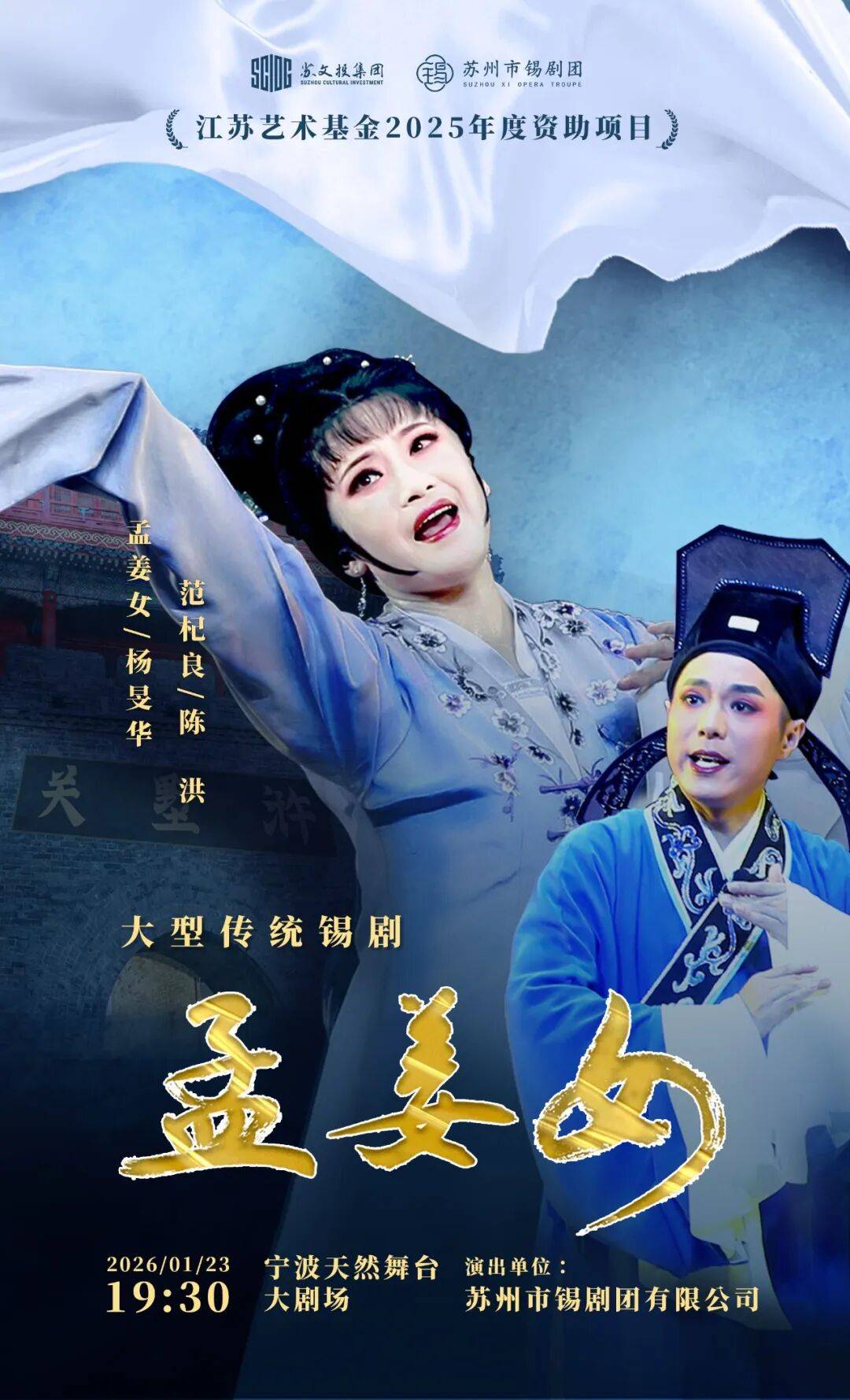 苏州市锡剧团精心复排的经典锡剧《孟姜女》,入选江苏艺术基金2025年度资助项目,已在苏州开明大戏院成功首演,开启了省内巡演。该剧将于1月23日、31日分别在宁波天然舞台大剧场与扬州宝应大剧院继续上演。