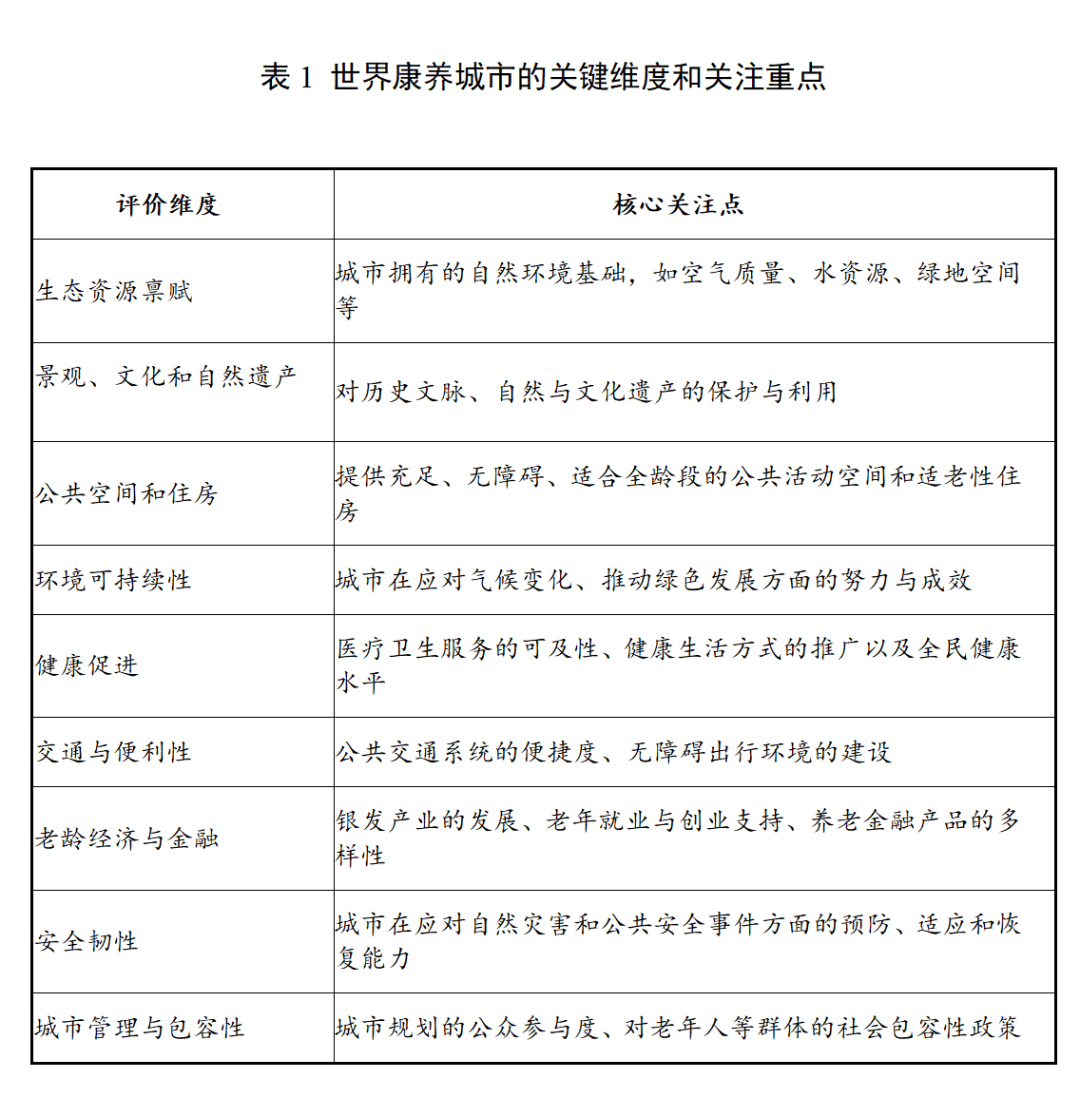 世界康养地主要是指“世界康养城市”,其标准由联合国国际老龄组织(UNIAP)联合世界卫生组织、联合国环境署、ISO、SDG等国际机构共同制定,是全球康养城市建设领域最权威的国际标准。该标准通过“物理环境供给性指标”和“社会环境包容性指标”两大领域,涵盖“60多项具体评价指标”,旨在为各国建设健康、包容、宜居的城市提供明确目标和实施策略。联合国“世界康养城市”的标准是一套全面的评价体系,目的是指导全球城市科学地建设健康与老年友好的宜居环境。表1是其核心框架和关键维度。