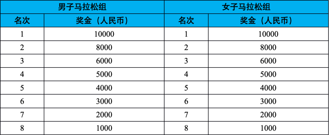 按净计时成绩分别录取男女前3名上台领奖,按净计时成绩分别录取男女第4至8名给予奖励,具体奖励标准(见下表,单位:元/人民币)。